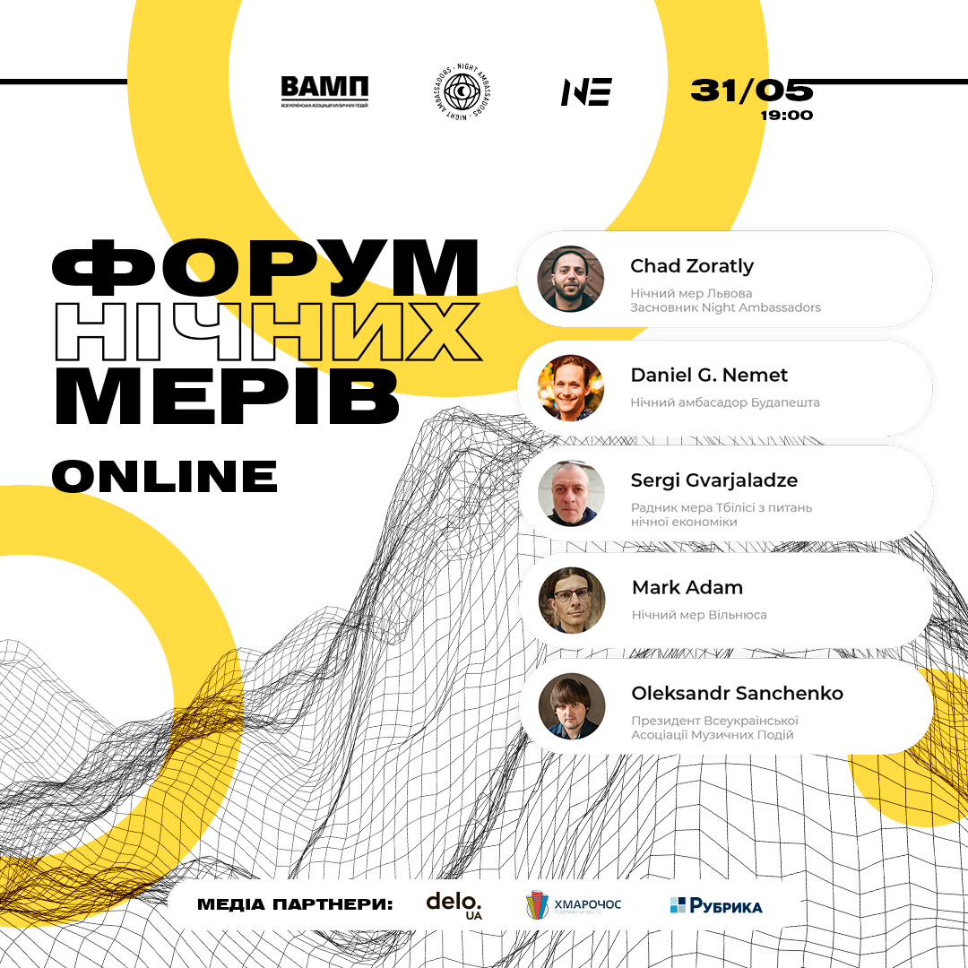 31-го травня о 19:00 Всеукраїнська Асоціація Музичних Подій та Night Ambassadors проводять онлайн-захід: “Форум нічних мерів. Online”.
